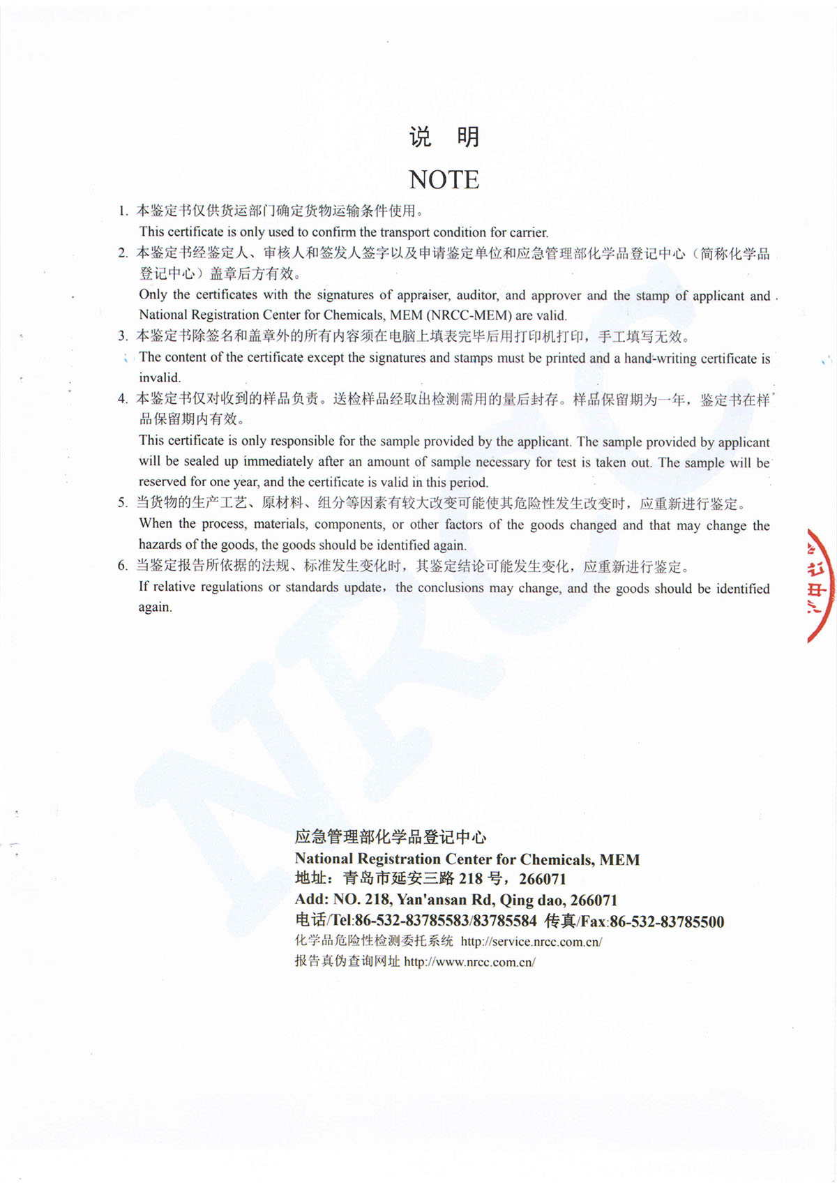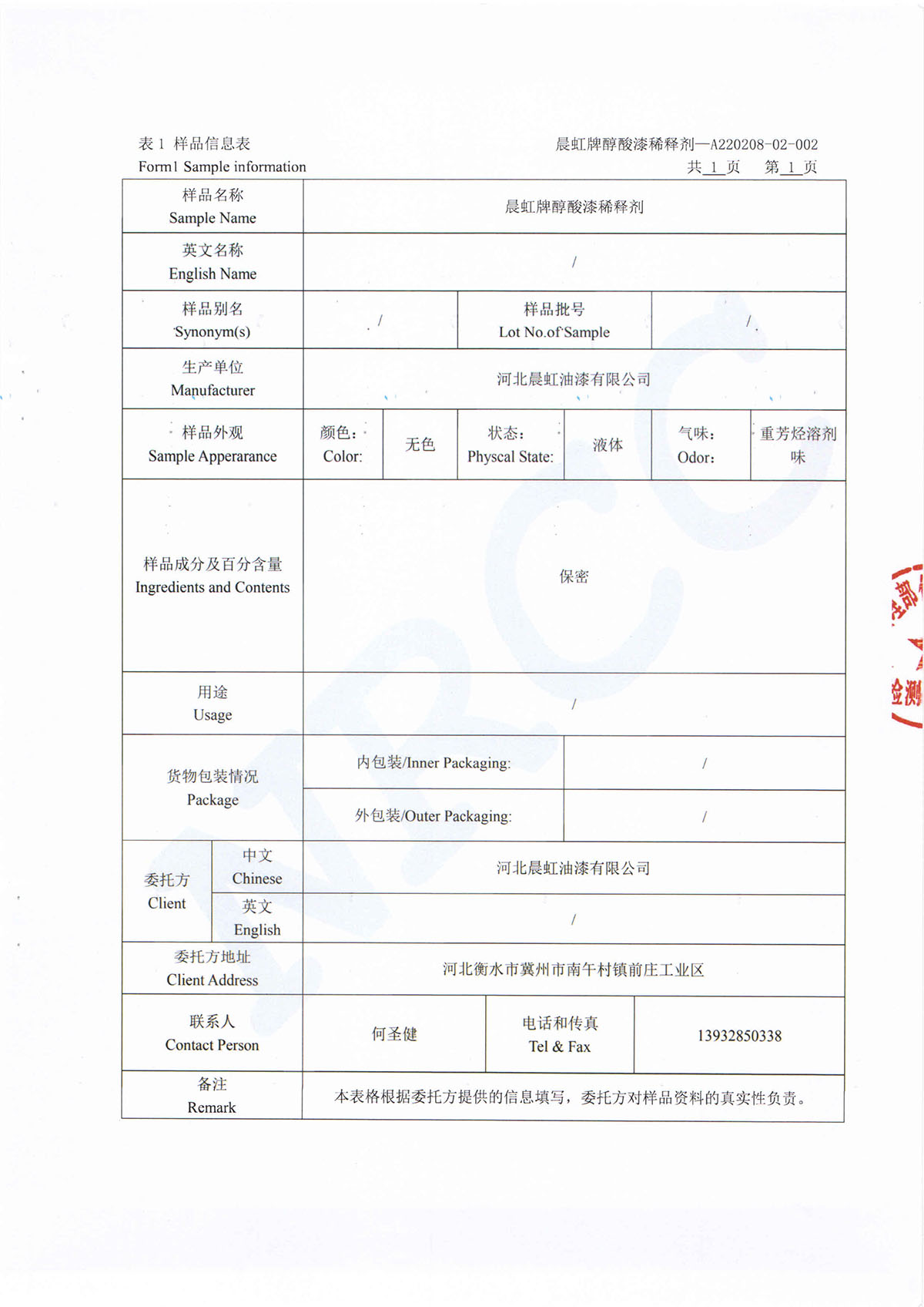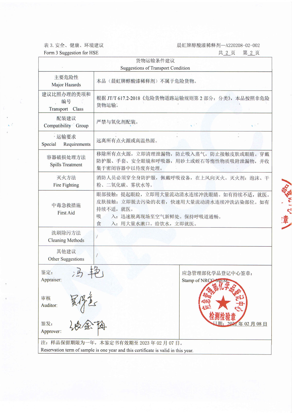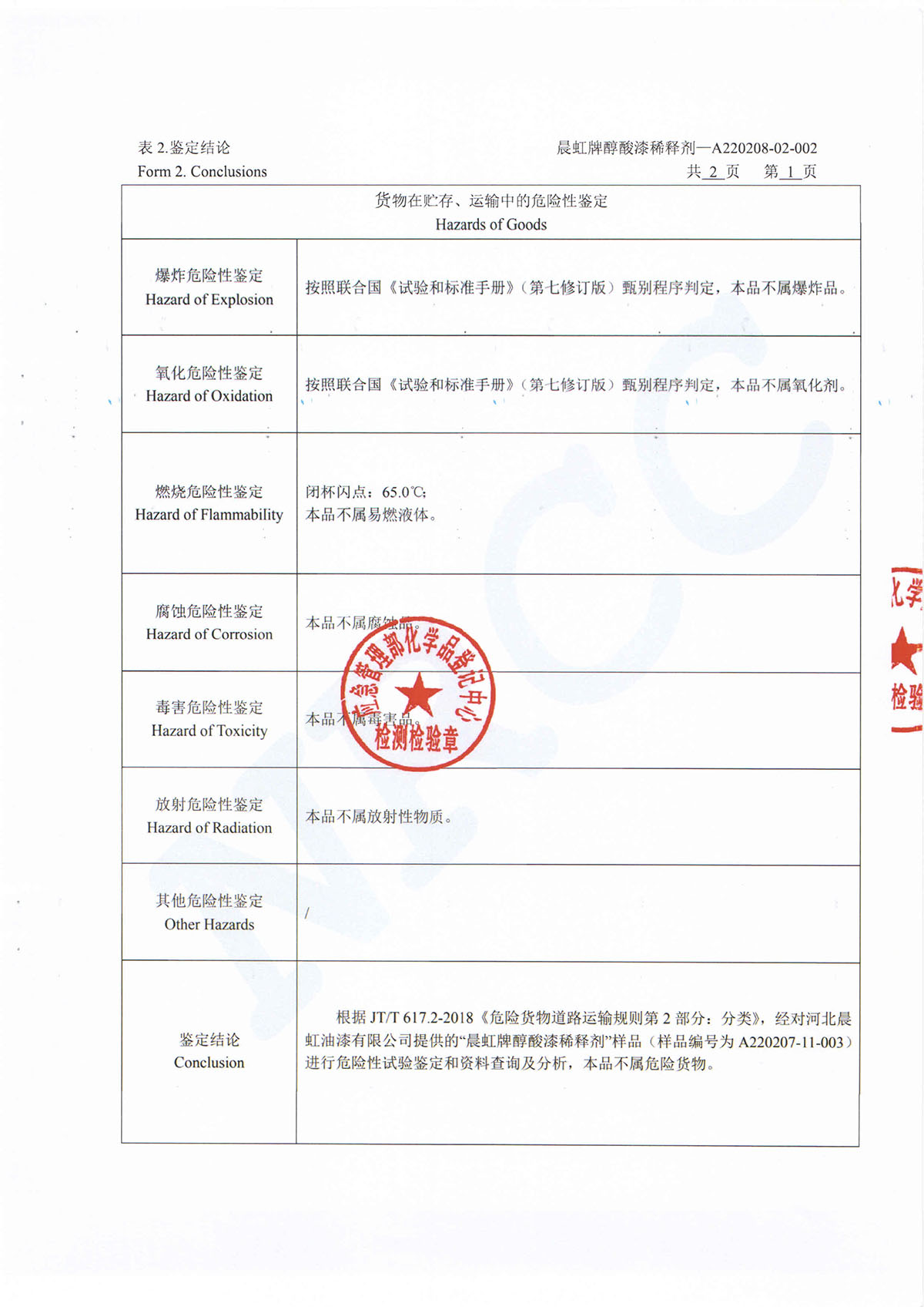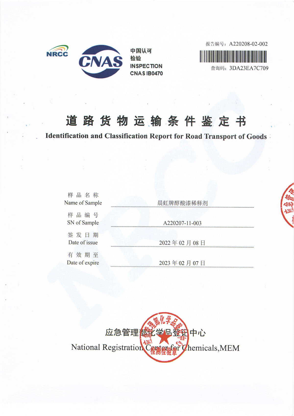晨虹牌醇酸漆稀釋劑道路貨物運(yùn)輸條件鑒定書